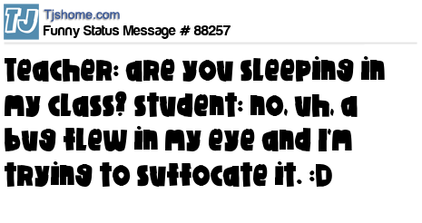 X is teacher: are you sleeping in my class? student: no, uh, a bug flew in my eye and I'm trying to suffocate it. :D