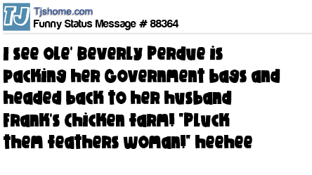 X is I see ole' Beverly Perdue is packing her Government bags and headed back to her husband Frank's Chicken farm! "Pluck them feathers woman!" heehee