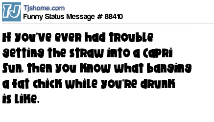 X says If you've ever had trouble getting the straw into a Capri Sun, then you know what banging a fat chick while you're drunk is like.
