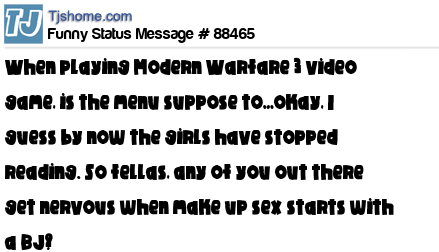 X says When playing Modern Warfare 3 video game, is the menu suppose to…okay, I guess by now the girls have stopped reading. So fellas, any of you out there get nervous when make up sex starts with a BJ?