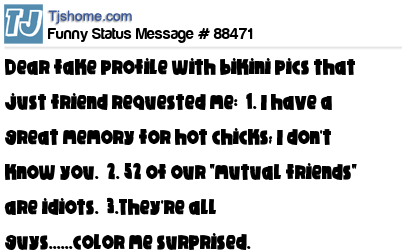 X Dear fake profile with bikini pics that just friend requested me: 1. I have a great memory for hot chicks; I don't know you. 2. 52 of our "mutual friends" are idiots. 3.They're all guys......color me surprised.