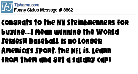 X congrats to the NY Steinbrenners for buying....I mean winning the World Series!! Baseball is no longer America's Sport, the NFL is. Learn from them and get a salary cap!