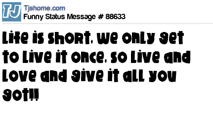 - # 67151 You only live once. Have fun, enjoy life to the fullest, do what you want and don't look back, smile, love somebody. live for the future, not the past. Life is too short to be p!ssed off all the time!