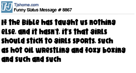 X if the Bible has taught us nothing else, and it hasn't, it's that girls should stick to girls sports, such as hot oil wrestling and foxy boxing and such and such