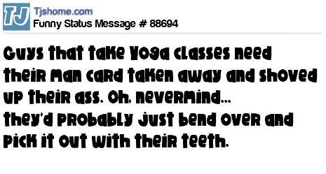 X Guys that take Yoga classes need their man card taken away and shoved up their ass. Oh, nevermind... they'd probably just bend over and pick it out with their teeth.