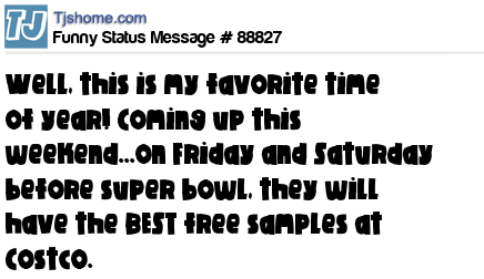 X is Well, this is my favorite time of year! Coming up this weekend...on Friday and Saturday before super bowl, they will have the BEST free samples at Costco.