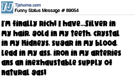 X I'm finally rich! I have...Silver in my hair, gold in my teeth, crystal in my kidneys, sugar in my blood, lead in my ass, iron in my arteries ans an inexhaustable supply of natural gas!
