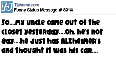- # 105875 My uncle came out of the closet yesterday. He's not gay. He has Alzheimer's and thought it was the car.