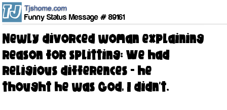 X Newly divorced woman explaining reason for splitting: We had religious differences - he thought he was God, I didn't.