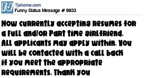 X is now currently accepting resumes for a Full and/or Part time girlfriend. All applicants may apply within. You will be contacted with a call back if you meet the appropriate requirements. Thank you