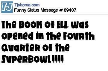 X The Book of ELI, was opened in the Fourth Quarter of the SuperBowl!!!!
