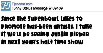 X Since the Superbowl likes to promote has-been artists, I take it we'll be seeing Justin Bieber in next year's half time show