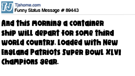 X And this morning a container ship will depart for some third world country, loaded with New England Patriots Super Bowl XLVI Champions gear.