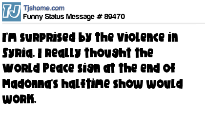 X I'm surprised by the violence in Syria. I really thought the World Peace sign at the end of Madonna's halftime show would work.
