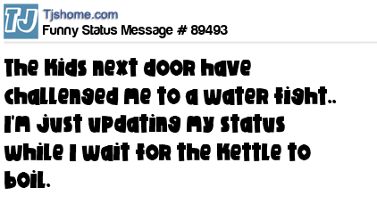 - # 30721 The kids next door have challenged me to a water fight... I'm just updating my status while I wait for the kettle to boil