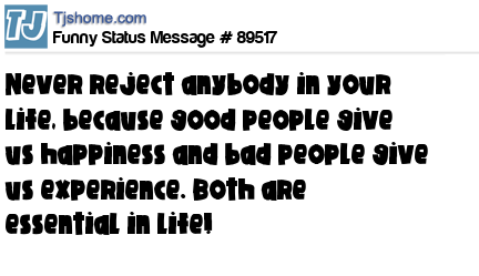 X Never reject anybody in your life, because good people give us happiness and bad people give us experience. Both are essential in life!