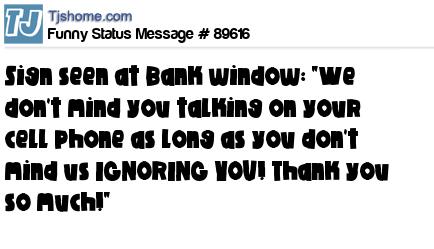 X Sign seen at Bank window: "We don't mind you talking on your cell phone as long as you don't mind us IGNORING YOU! Thank you so much!"
