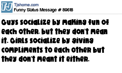 X is Guys socialize by making fun of each other, but they don't mean it. Girls socialize by giving compliments to each other but they don't meant it either.