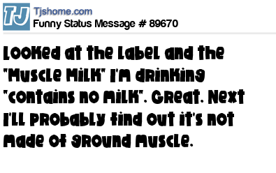 X is Looked at the label and the "Muscle Milk" I'm drinking "contains no milk". Great. Next I'll probably find out it's not made of ground muscle.