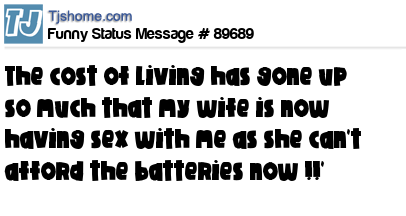 X is The cost of living has gone up so much that my wife is now having sex with me as she can't afford the batteries now !!'
