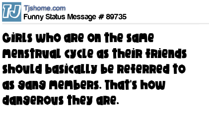- # 58810 Girls who are on the same menstrual cycle as their friends should basically be referred to as gang members... that's how dangerous they are.