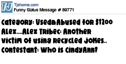 X Category: Used&Abused for $1200 Alex....Alex Tribec: Another victim of using recycled jokes.. Contestant: Who is CindyAnn?