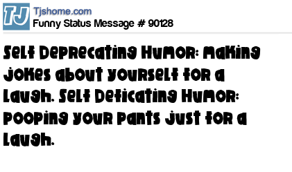 X says Self Deprecating Humor: making jokes about yourself for a laugh. Self Deficating Humor: pooping your pants just for a laugh.