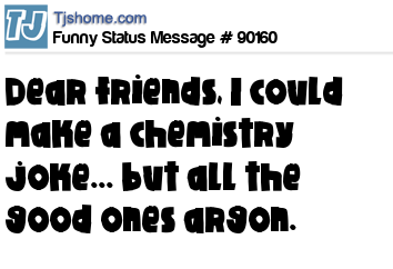 - # 157177 Chemists tell great joke, but they don't get a reaction because all their people skills Argon. OMG... that's Sodium funny, right? NA? Okay.