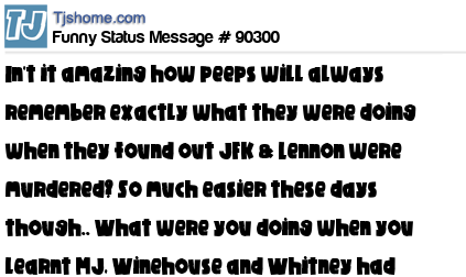 X In't it amazing how peeps will always remember exactly what they were doing when they found out JFK & Lennon were murdered? So much easier these days though.. What were you doing when you learnt MJ, Winehouse and Whitney had died? Browsing FB of course!
