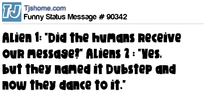 - # 109168 Alien 1: “Did the humans get our message?” Alien 2: “Yeah, but they named it dubstep and dance to it.”