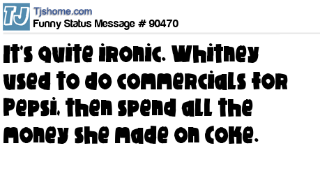 - # 90451 It's quite ironic. Whitney used to do commercials for Pepsi, then spend all the money she made on Coke