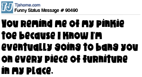 - # 103738 You remind me of my pinky toe. You're small, cute, and I'm probably going to bang you on the coffee table later tonight