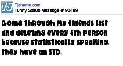 - # 196893 Going thru my friends list and deleting every 5th person because statistically speaking, they have an STD.