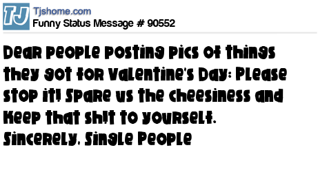 X says Dear people posting pics of things they got for Valentine's Day: Please stop it! Spare us the cheesiness and keep that sh!t to yourself. Sincerely, Single People