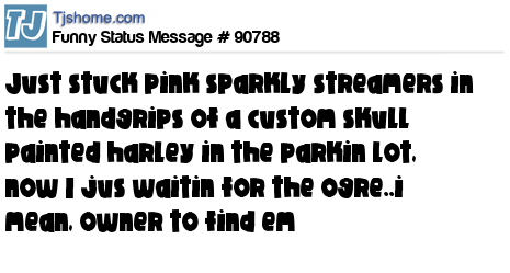 X is just stuck pink sparkly streamers in the handgrips of a custom skull painted harley in the parkin lot, now I jus waitin for the ogre..i mean, owner to find em