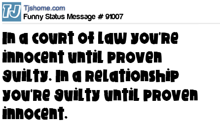 X is In a court of law you're innocent until proven guilty. In a relationship you're guilty until proven innocent.