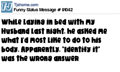 - # 178274 Last night we were in bed and I asked my wife "What would you like to do to my body more than anything else?" She said "Identify it." FML.