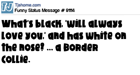 - # 90394 What's black, lies on the floor, "Will Always Love You" and has white stuff around it's nose? A border collie.