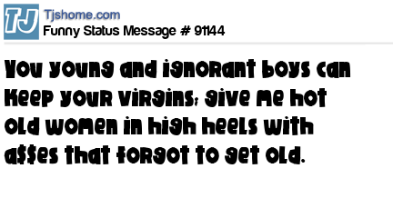 X says You young and ignorant boys can keep your virgins; give me hot old women in high heels with a$$es that forgot to get old.