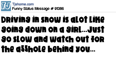 X is Driving in snow is alot like going down on a girl...Just go slow and watch out for the a55hole behind you...