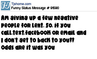 - # 91643 I am giving up a few negative people for lent. So, if you call,text,tweet or email and I don't get to back to you?? Odds are it was you.