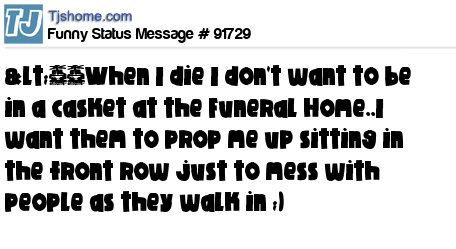 X says <~~When I die I don't want to be in a casket at the Funeral Home..I want them to prop me up sitting in the front row just to mess with people as they walk in ;)