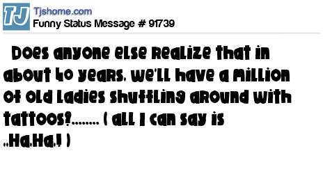 X ■Does anyone else realize that in about 40 years, we'll have a million of old ladies shuffling around with tattoos?........ ( all I can say is ,,Ha,Ha,! )