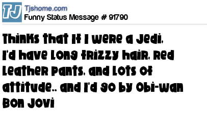 - # 56592 If I were a Jedi, I'd have long frizzy hair, red leather pants, and lots of attitude.. and I'd go by Obi-wan Bon Jovi.
