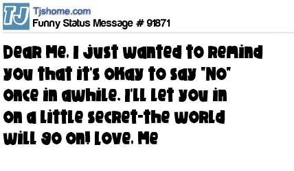 X says Dear Me, I just wanted to remind you that it's okay to say "No" once in awhile. I'll let you in on a little secret-the world will go on! Love, Me