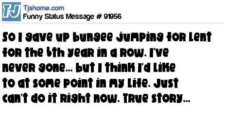X says So I gave up bungee jumping for lent for the 6th year in a row. I've never gone... but I think I'd like to at some point in my life. Just can't do it right now. True story...