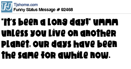 X  "It's been a long day!" ummm unless you live on another planet, our days have been the same for awhile now.