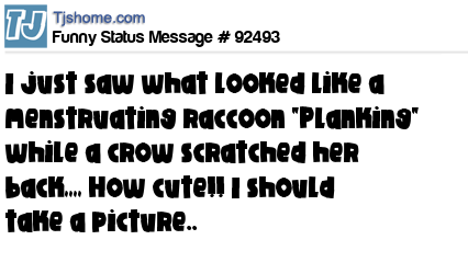 X I just saw what looked like a menstruating raccoon "Planking" while a crow scratched her back,,,, How cute!! I should take a picture..