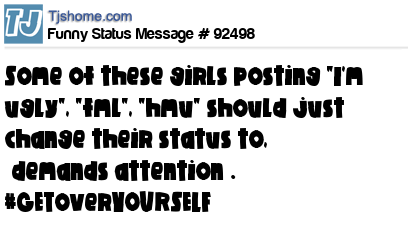 X says Some of these girls posting "I'm ugly", "fml", "hmu" should just change their status to, “demands attention”. #GEToverYOURSELF