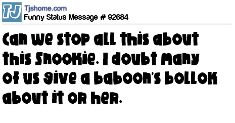 X  Can we stop all this about this Snookie. I doubt many of us give a baboon's bollok about it or her.